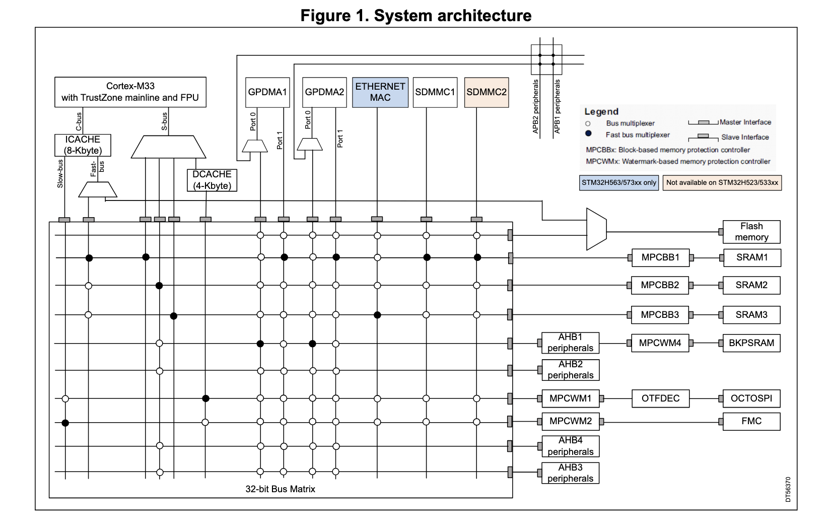 For the STM32H5, the GPIO pins are all connected to what’s known as the AHB (advanced high-performance bus), a protocoll under the umbrella of ARM’s “Advanced Microntroller Bus Architecture” (AMBA). In fact, they are connected to the second AHB, AHB2 (there are a total of 4 of these buses in this chip).
