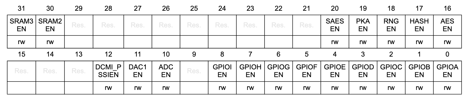 Let’s have a closer look at the layout of the RCC_AHB2ENR register from section 11.8.27: