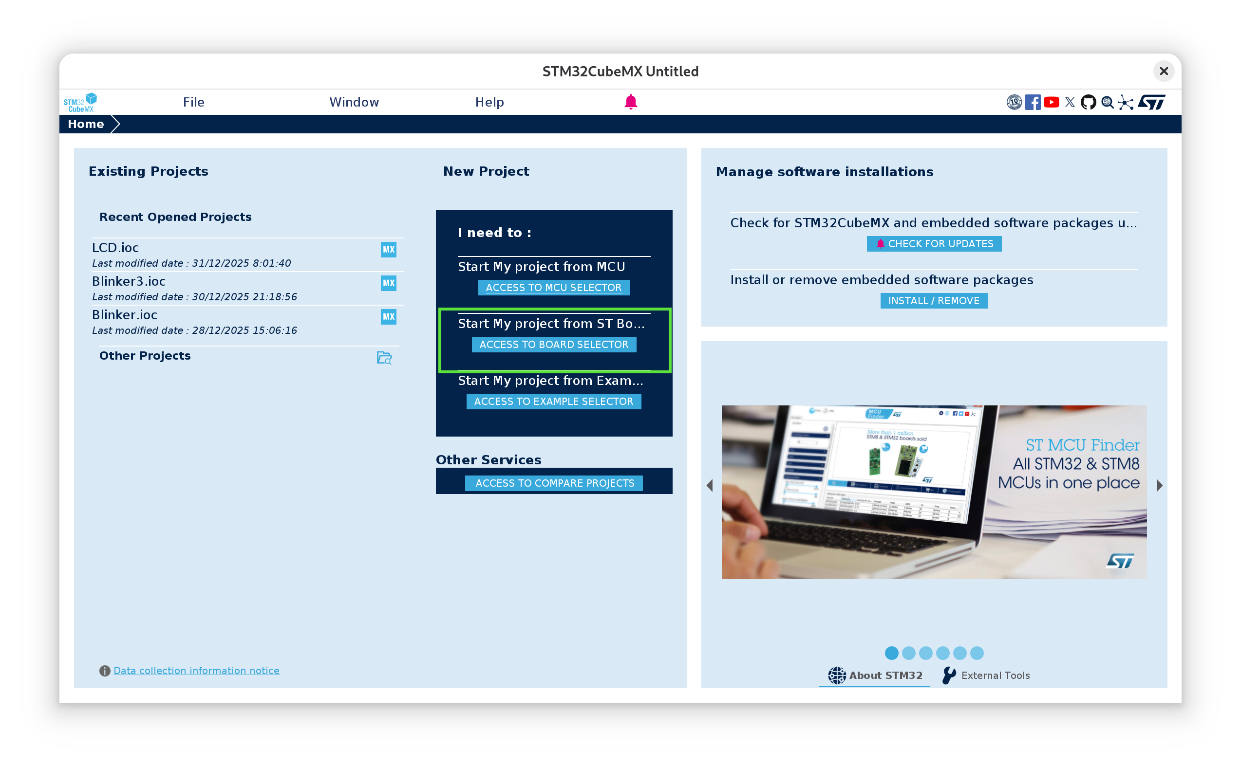 So let’s go ahead and download that. Once installed, generating our LED app is relatively straight forward. We’ll open the app and select “Start My project from ST Board Selector”