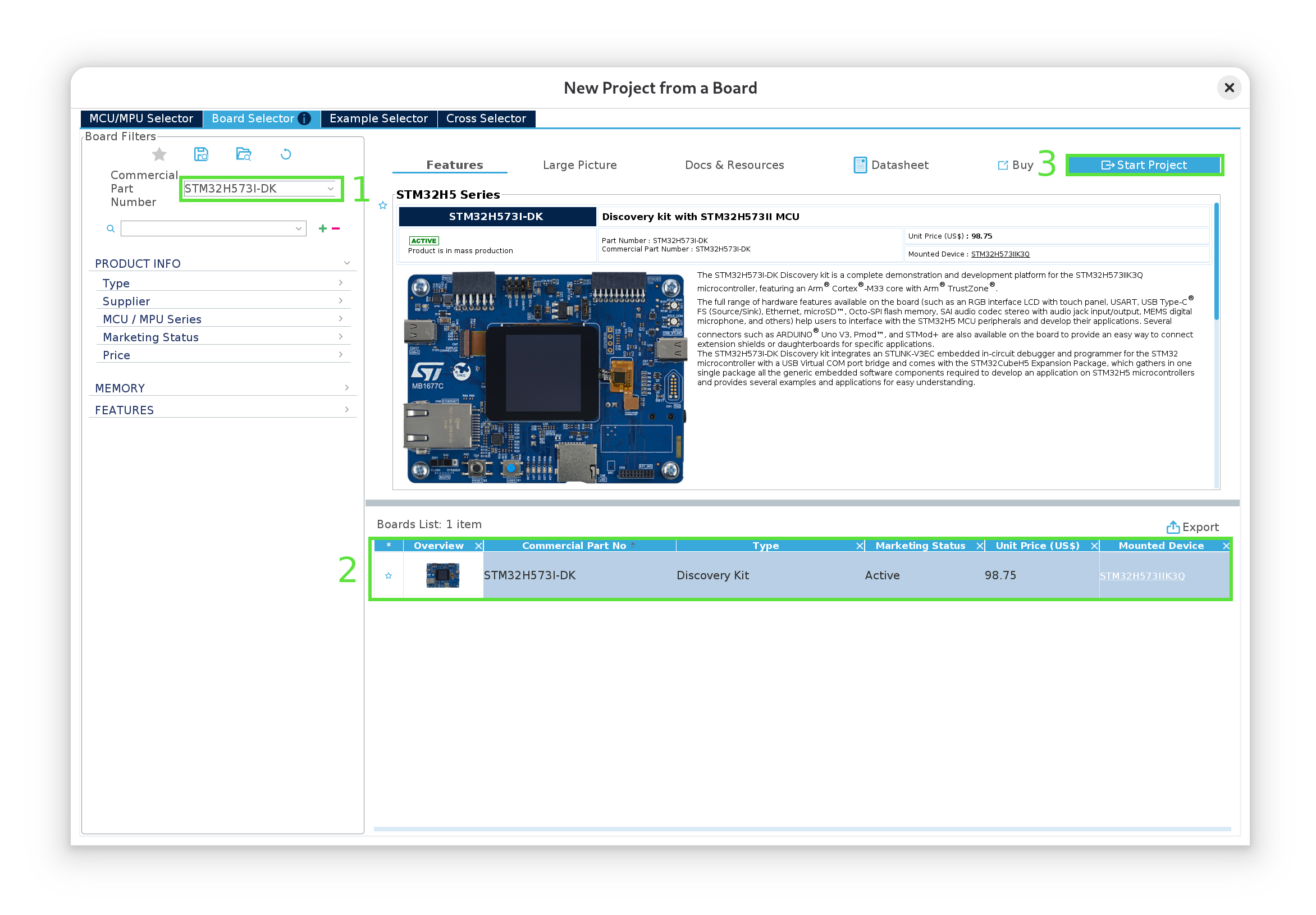 Then we’ll type in the name of our board (1), select it (2) and click “Start Project” (3):