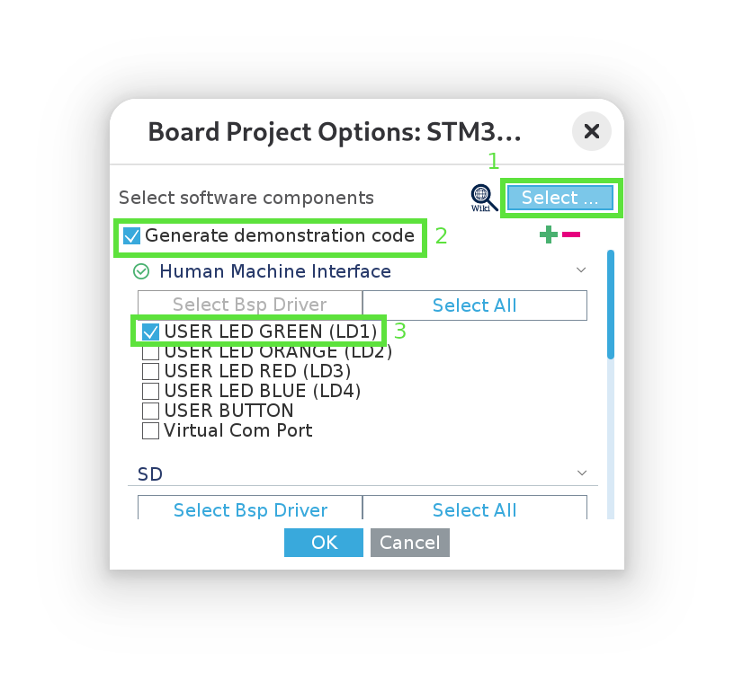 Select “without trustzone activated” when prompted. Then, in the next popup window, unselect all examples (1), select “generate demonstration code” (2) and select “USER LED GREEN (LD1)” (3):