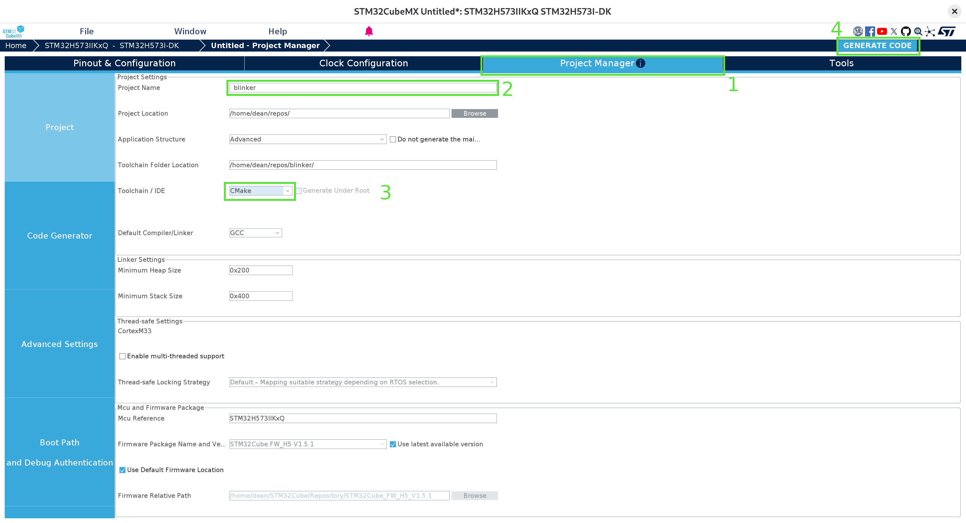 Wait for the UI to render, then: go over to the “Project Manager” tab (1), fill in the project name (2) (and project location, if necessary), ensure CMake is the selected toolchain (3), and then generate the code! (4):