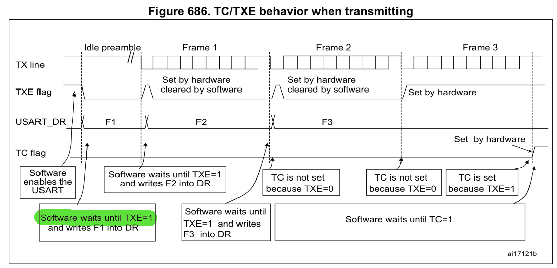 We see here that every time something is transmitted over TX, once the hardware is finished, it sets the TXE flag to 1 to indicate that it’s safe to load the next character into data register. So that’s what we’ll have to do. The TXE flag is located in the USART_ISR register.