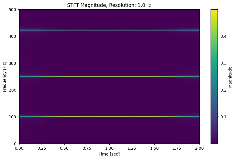 plt.title(f'STFT Magnitude, Resolution: Hz')