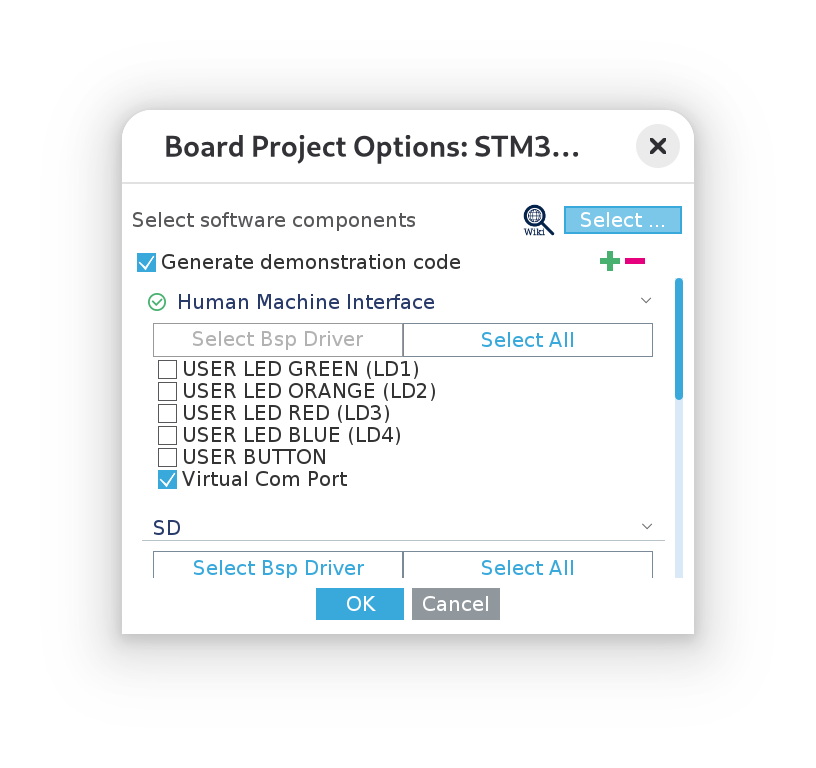 We’ll once again start by using the provided sample code to get a working example and then see if we can cut the code down to really understand what’s going on. We’ll fire up CubeMX and start a new project from the board selector, as we did in the previous article. However, this time, we’re going to start out selecting the “Virtual Com Port” example: