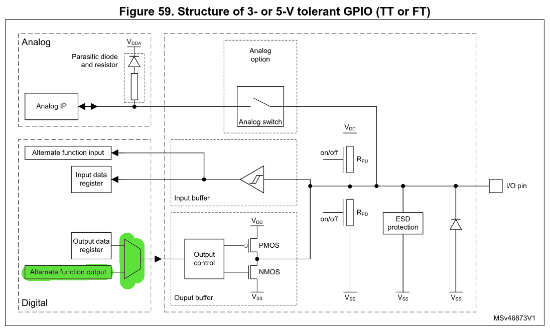 Each pin in the AFRH is assigned 4 bits, which in turn combine to give one of 16 AFs (0b0000-0b1111). We saw already in the table in the datasheet that we need AF7, so we we’ll set the value 0b0111 when we’re ready.