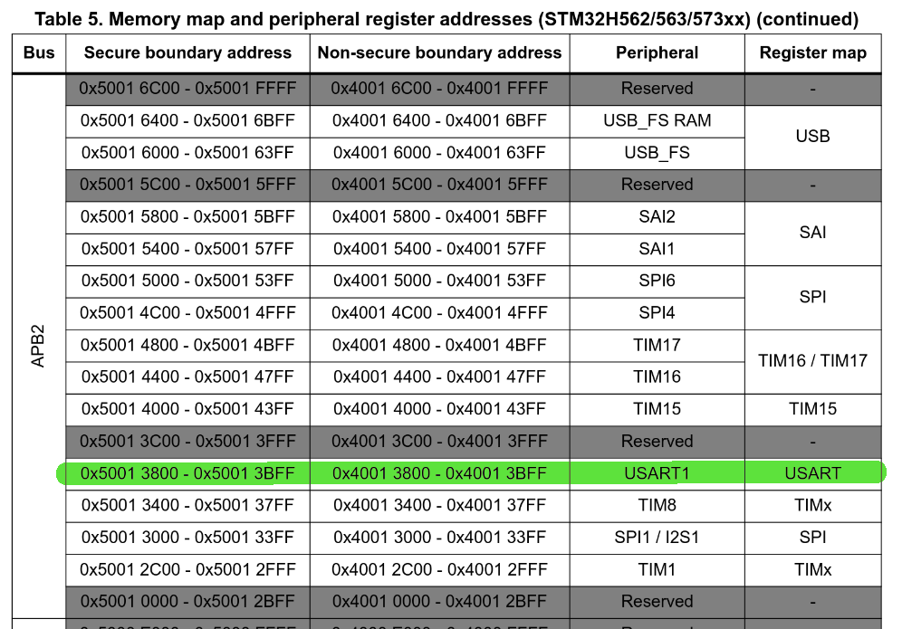 Before we can do any of this though, we also need to set the GPIOA clock gate to on in the RCC_AHB2ENR (GPIO is located on the AHB2 bus), and similarly, before we can start sending our bytes, we’ll need to enable the clock for UART1, which is located on the APB2 bus, as we saw above.