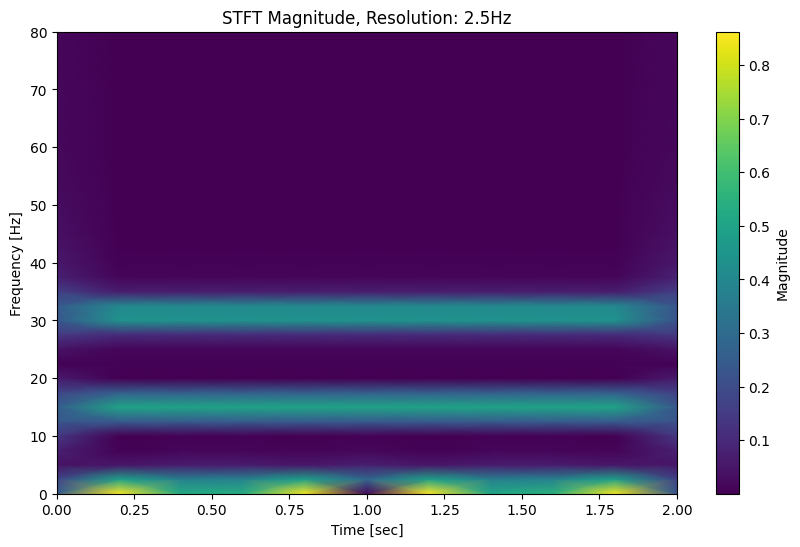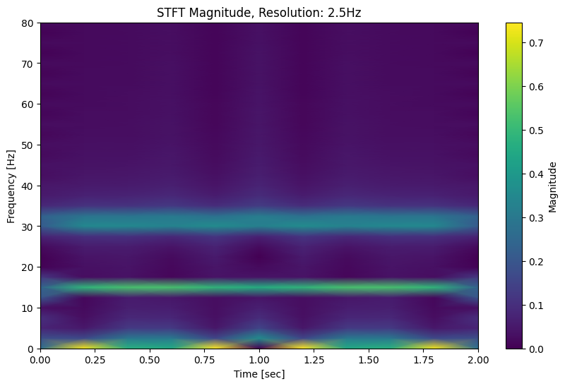 As an example, a fs of 160 and nf = 64, we get a resolution of ~2.5Hz.